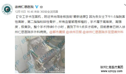 整台手术持续6个小时,15日下午一点多才完成。目前朱女士已被转入手外科病房进一步观察。