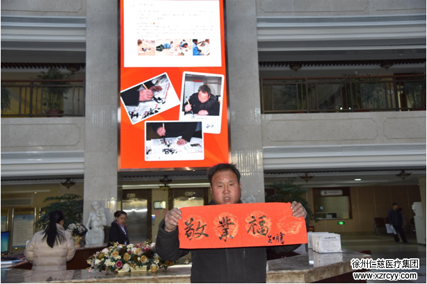 约定的时间到了,拿着书写工具,在工作人员的陪伴下,“励志哥”吴明在betway在线登陆新门诊大厅一楼,开始为医护人员、患者、家属、及闻讯赶来的周边居民送福写春联。
