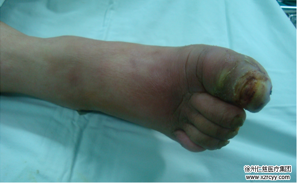 原本脚底很小的破损,出现了感染,大脚趾出现红肿、伤口不流脓。