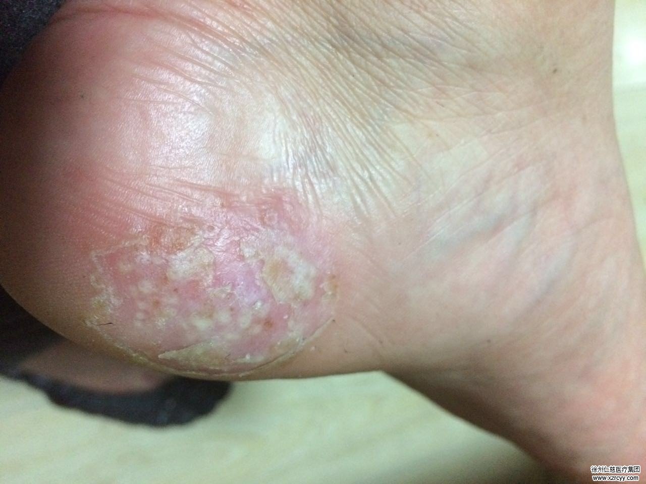 “我看看你的脚”,在王娜医生的要求下,丁先生脱掉鞋袜,左脚内侧一个如鸡蛋般大小,夹杂着黄白色浓泡和皮屑的患处,暴露出来。“这种情况不太常见,但从实际情况来看,很有可能是掌跖脓疱症。”随后的病理检查,验证了王医生的判断。