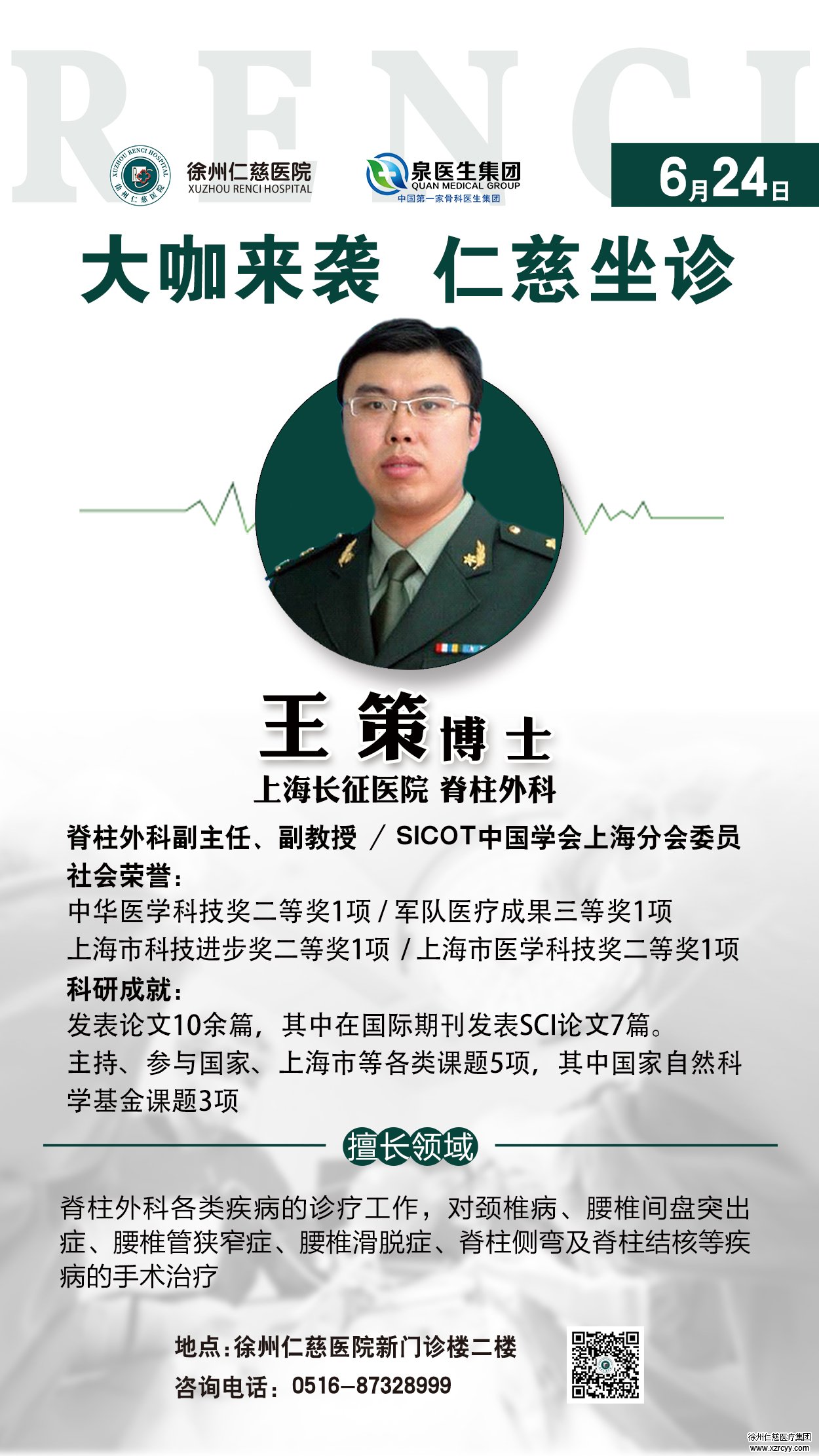 明天(6月24日),泉医生集团签约专家第二军医大学附属上海长征医院脊柱外科王策博士将在betway在线登陆为广大脊柱病患者义诊,更重要的是,除专家挂号费全免外,DR、CT、核磁等检查半价优惠!
