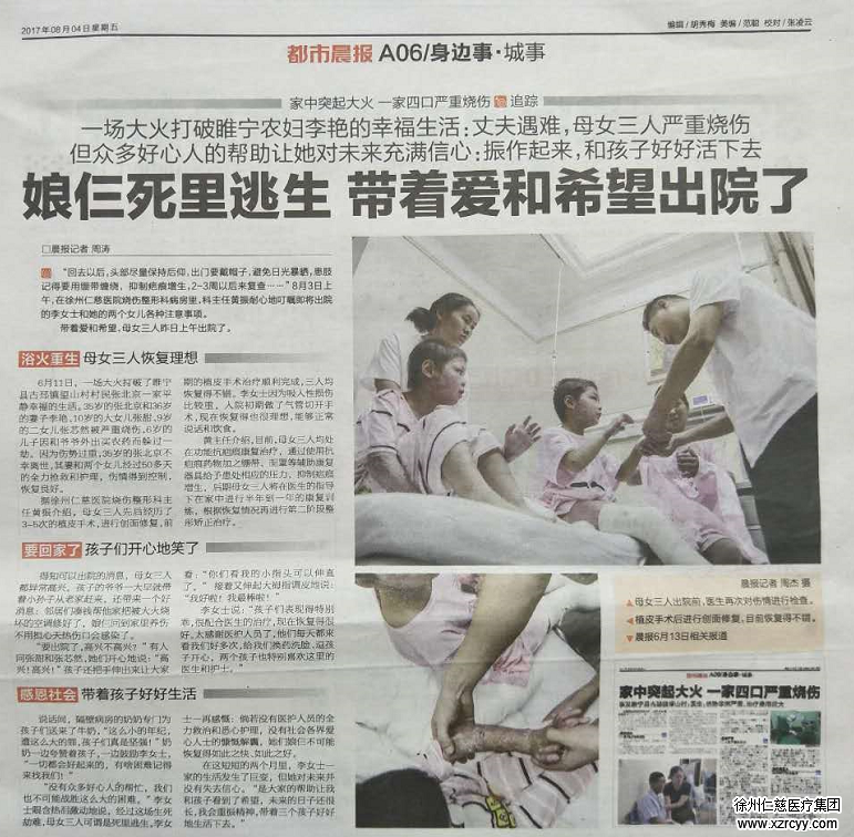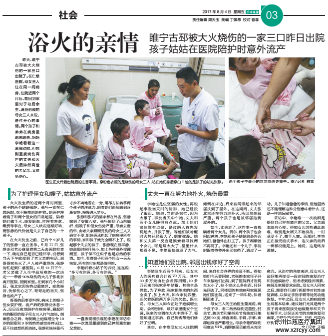 6月11日,一场大火无情地夺去了睢宁县古邳镇望山村村民张长军(化名)一家平静幸福的生活。因为伤势过重张长军不幸离世。但庆幸的是,其妻子李女士和两个女儿大甜、二甜经过医护人员50多天的全力抢救和护理,伤情得到了很好的控制。