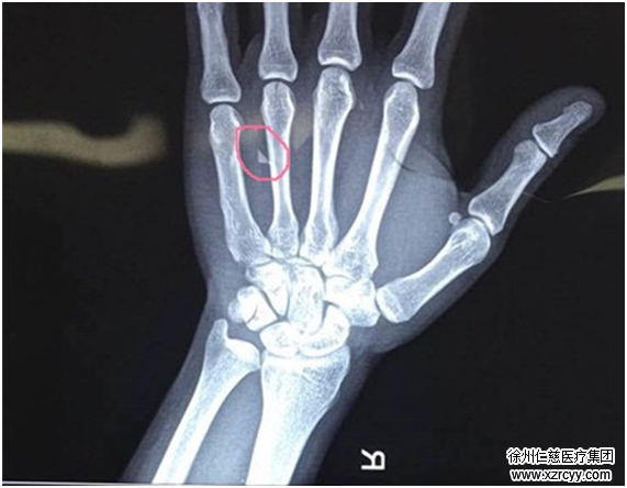 经过DR检查发现,其右手第5掌骨前缘皮质不连续,右手第4掌骨尺侧软组织内有异物留存。医生给小王开了点消炎药,建议他静养、休息观察一段时间,然后做个简单的异物取出术。