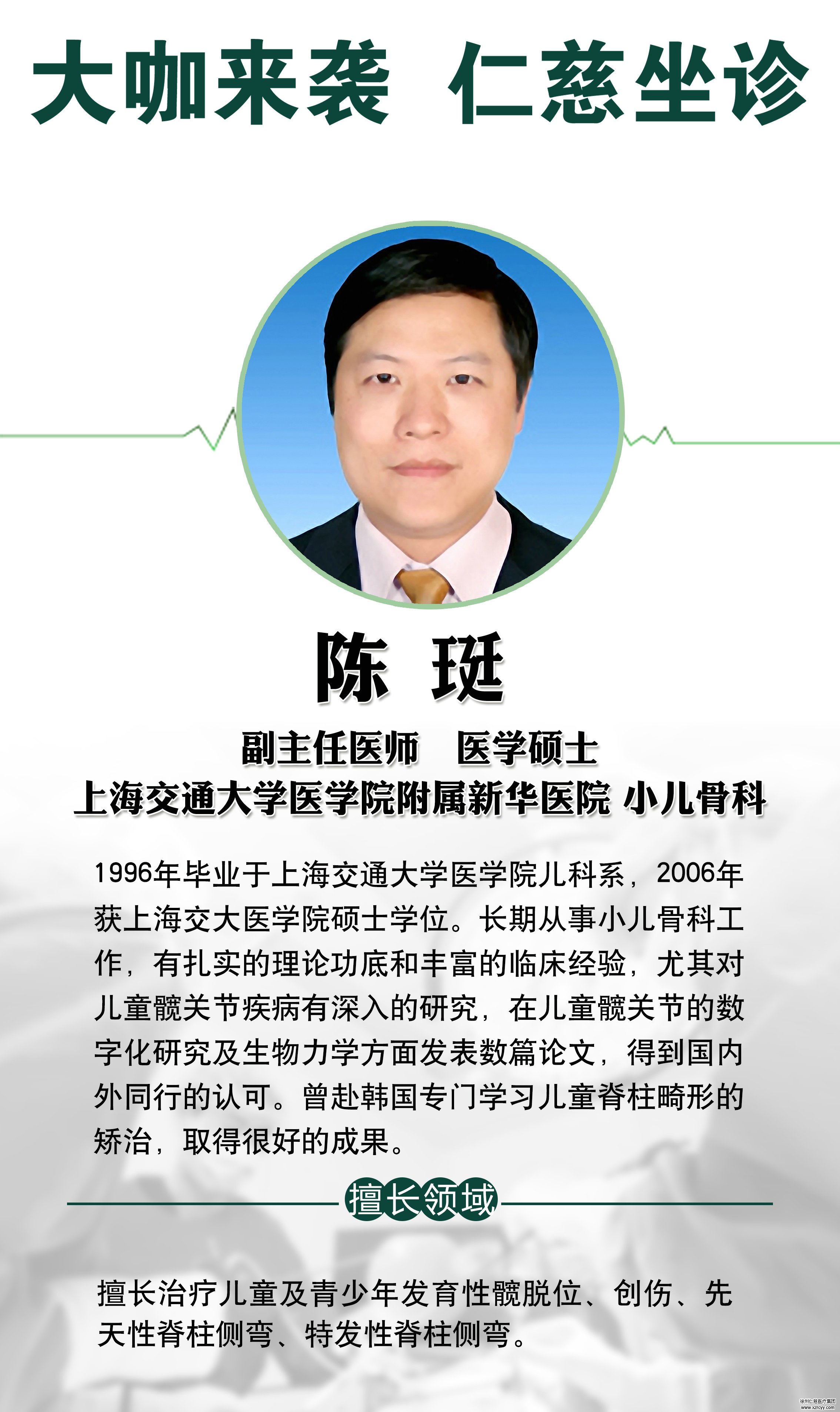 3月3日(本周六)上午,上海新华医院骨科专家陈珽主任应邀来我院坐诊,为广大的儿童骨病患者带来更加专业的诊疗。