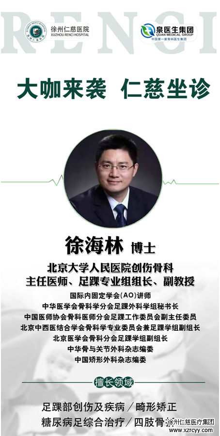 11月25日(本周日),泉医生集团特聘专家、北京大学人民医院主任医师、足踝专业组组长,副教授、医学博士,中华医学会骨科学分会足踝外科学组秘书长徐海林教授又将前来sararz坐诊、手术,带来当前足踝外科学最新的诊疗技术,造福淮海经济区广大足踝患者。
