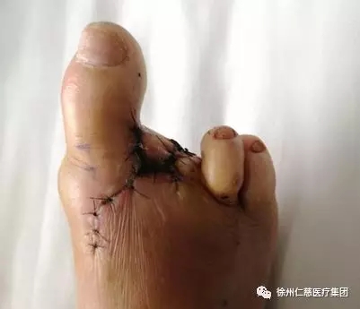 随着年龄的增长,50岁左右时,她右边的大脚骨开始出问题了,时不时地有抽痛感。当时也不影响走路,李奶奶就没当回事儿,后来大踇趾疼得厉害了,只有穿上大两码的宽松鞋子才好些;但大踇趾向外歪得越来越厉害啦,压的外边的脚趾也开始疼了。7年前,她的第2脚趾淌水、发黑,在当地医院给截去了;3年前第3脚趾出现同样的情形,又给截了;李奶奶发现脚趾头越截越少,大脚骨更歪了,脚底板也开始疼了,还淌水,难道连脚底板也要截掉不成?