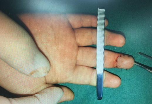 术中探查发现,患者右中指血管、神经均有损伤,并且指骨骨折,唐洪伟医生医疗小组为患者右中指清创后,一一吻合修复受损的血管、神经以及撕脱的皮肤,手术一切顺利。