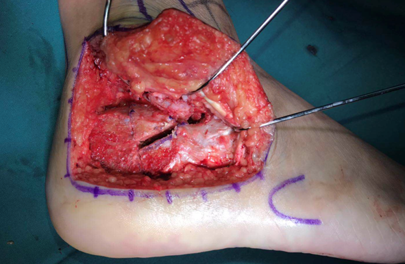 术中,手术团队于患者右跟骨处做长约15厘米L形切口,充分暴露跟骨、距下关节,截除跟骨膨隆的外侧壁,术中设计跟骨T行截骨,向上推移距下关节,跟骨向下推移1厘米,纠正跟骨外翻,予以克氏针、空心针固定距骨,确定距下关节对位良好,内固定在位。术后,患者被推回足踝一病区康复。