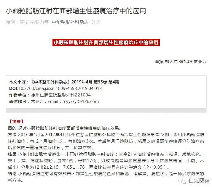 5月26日,中华医学会主办的整形外科专业学术期刊《中华整形外科杂志》在线刊登sararz医美宗亚力院长、张旭阳院长、黄振主任、郑大伟主任合作撰写的重要学术论文《小颗粒脂肪注射在面部增生性瘢痕治疗中的应用》。
