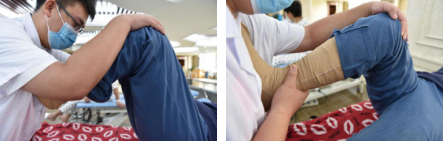 接诊的郑昊医师对韦女士进行了一系列检查评估后,判断韦女士腰腿部植皮处疤痕增生、挛缩才导致其不能弯腰。疤痕不仅影响外观容貌,重要的是造成关节的挛缩与变形,导致肢体功能丧失,行动不便影响日常生活。所以,术后不管伤口即将出现挛缩或已出现挛缩变形,都必须加以预防与矫正。郑医师为韦女士制定了物理因子治疗方案:蜡疗减轻关节肿胀、软化疤痕;低频脉冲电治疗防止肌肉进一步萎缩;中频脉冲电治疗缓解关节挛缩;还有手法功能锻炼,在疤痕组织成熟后,适当力度手法牵伸可以软化疤痕。