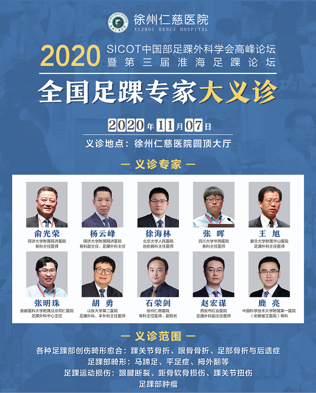 11月7日,由国际矫形与创伤外科学会(SICOT)中国部足踝外科学会、徐州市医学会、betway在线登陆共同主办的2020 SICOT中国部足踝外科学会高峰论坛暨第三届淮海足踝论坛将在徐州召开,上海市同济医院俞光荣教授等10多位国内知名足踝外科专家学者将莅临大会作学术分享交流。足踝论坛举办期间,betway在线登陆将邀请参会足踝专家举办联合大义诊,并遴选疑难重症患者由专家操刀手术。