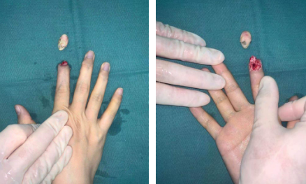 这位患者身份特殊,她不仅是一名年轻的女性,而且是临床的医学生,正在实习期间。受伤那天,她在自家超市帮忙收银,或许是许久未操作技术生疏了,一刹那,她的右手示指被传送带夹住了。虽然她立刻暂停机器,取出手指,但为时已晚,她的右手示指指尖被挤掉了,颜色发白。