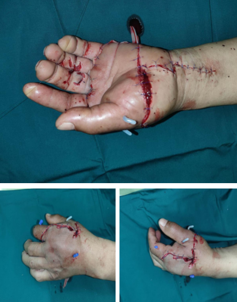 手术开始,探查拇示指离断,手掌撕脱的皮肤内还包含了中环小指的屈肌腱和血管神经,这极大增加了手术难度,肌腱及血管、神经都需要进行2处缝合。术中先将侯先生左手断裂的骨折端复位固定,在高倍显微镜下找到所有离断的动静脉、肌腱、神经,分别进行吻合,一次通血成功!手术长达11个小时,手术非常成功。