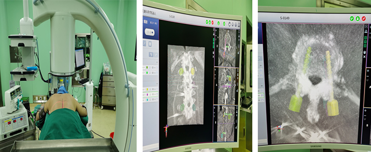 患者是一名55岁的男性,因高处坠落导致 L2、L4椎体骨折,疼痛,难以动弹。脊柱科孟磊副主任医师为患者检查后,和尚军主任进行了严谨的术前讨论,考虑到患者年纪不大,跨节段双椎体骨折,切开复位内固定术需剥离双侧椎旁肌,创伤大、出血多、术后疼痛恢复慢,因此,决定采取经皮椎弓根内固定术,可减少出血和对椎旁肌肉的干扰,有利于早期恢复并下地活动。