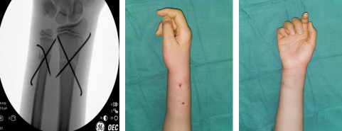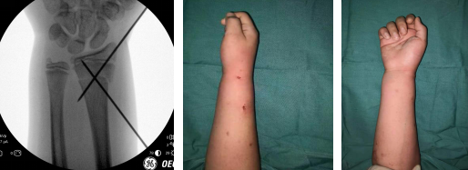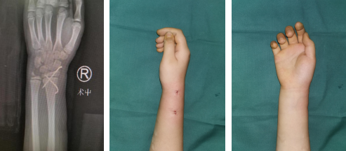 三患儿的共同特点:年龄小,骨质软,都是右桡骨远端骨折。考虑常规切开手术对患儿腕关节周围组织产生破坏,后期会影响腕关节活动,考虑到三位患儿均年龄较小,切开复位后期疤痕形成,影响美观性,所以医生团队为三名患儿采用的是微创手术。术中手法复位右桡骨远端骨折端,C臂机透视见骨折对位良好,使用金属骨针固定右桡骨远端骨折端,手术非常顺利,现在三位患儿恢复很好。