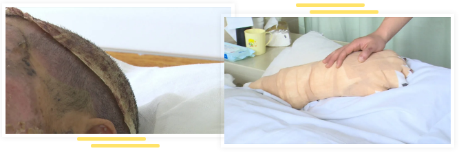 母子俩烧伤程度一不样,儿子烧伤较轻,治疗两周后已经出院,而王女士伤情较重, 在经过初期抗休克感染之后,就开始植皮,包括面部、双上肢、双下肢植皮。