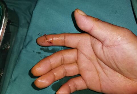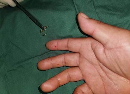 近日,家住新城区的刘大哥和几个好兄弟约着一起夜钓,他还没刚开始往河里甩钩呢,就被鱼钩钩住了右手食指,怎么取也取不下来。兄弟们还没到,十里八荒的也看不到一个人,于是刘大哥骑上电动车,急忙来到了betway在线登陆就诊。手外二病区的唐洪伟医生正在值夜班,接诊后,唐医生团队立刻给予急诊处理,在局麻下行“清创,异物取出术”。