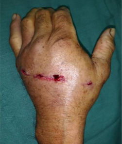 半年前,60多岁的李大伯在装卸货物时被车门挤伤左手,致左手背疼痛、出血、肿胀,包扎止血后,急来我院就诊。