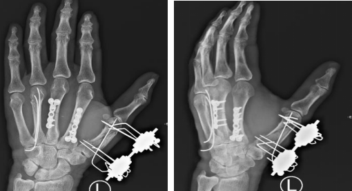 手外科一病区的滕道练副主任医师接诊,为患者安排查体,其左手背肿胀,几处开放性伤口,各长约1cm,创缘不齐,伤口深达掌骨,各指指端色红润,感觉良好,手背局部压痛,可触及骨擦感,各指可主动伸屈活动,幅度欠佳。左手正斜位X线片示:左手多发掌骨骨折,其中第1掌骨闭合性粉碎性骨折,第2、3掌骨横形骨折,第4掌骨头下骨折。