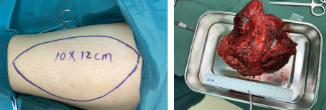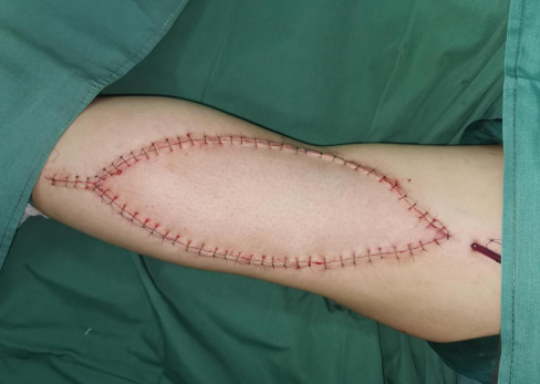 郑大伟主任、黎章灿医生及其团队经术前讨论,决定采用显微外科技术进行肿瘤切除修复,既可以彻底切除病变,也可以保留肢体血运,并制定了周密的手术方案。手术中将肿瘤扩大切除,分离至肿瘤的深部,显示肿瘤与腘动脉紧密粘连,腘动脉已被压迫菲薄,稍微损伤即可破裂,手术团队在显微镜下,利用娴熟的显微外科技术在腘动脉外膜下剥离,剥茧抽丝般完整切除肿瘤,并且保持血管完好无损,肿瘤切除后形成的巨大创面,采用股前外游离皮瓣进行了修复,手术历经6.5小时顺利完成,目前患者已恢复出院。