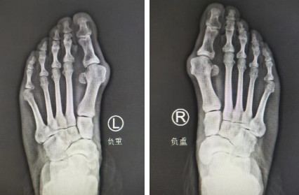 术前,张大妈双足负重位正侧位X线检查显示:双足拇外翻,双侧扁平足。
