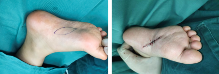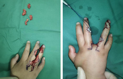 萱萱入院后,滕医生医疗小组为患儿进行了并指分指术。术中于右中环指掌侧、背侧各设计一连续“Z”字切口,于中环指掌指关节背侧设计一近似五边形皮瓣,掌侧设计“Y”形切口。切开皮肤,保护指固有动脉及神经束,形成带蒂筋膜皮瓣,将右中环指并指完全分开,充分减容,切除多余脂肪组织,于右足内侧切取同右中环指残留创面等大皮片,覆盖创面直接缝合。手术顺利。