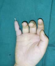 我院小儿骨科的李甲主任近日收治了一名患有斜指畸形的4岁女童。据女童妈妈描述,孩子出生时就发现其双手的小手指长得歪歪的,当时想着也不是大问题,一直没有就医。直到孩子上了幼儿园,才发觉小指弯曲程度加重,担心日后会影响孩子的正常学习,就想着来医院瞧瞧。女童妈妈还告诉李主任,女童的妹妹双手小指也是歪的。