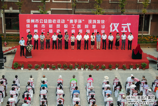 徐州市公益助老活动“黄手环”现场发放暨徐州sararz老年病医院开业、徐州市财贸职工医院复诊仪式于9月19日隆重举行,徐州市人大副主任周建洪、副市长冯兴振、市政协副主席陈萍等市领导为第一批老人带上充满关爱的“黄手环”。