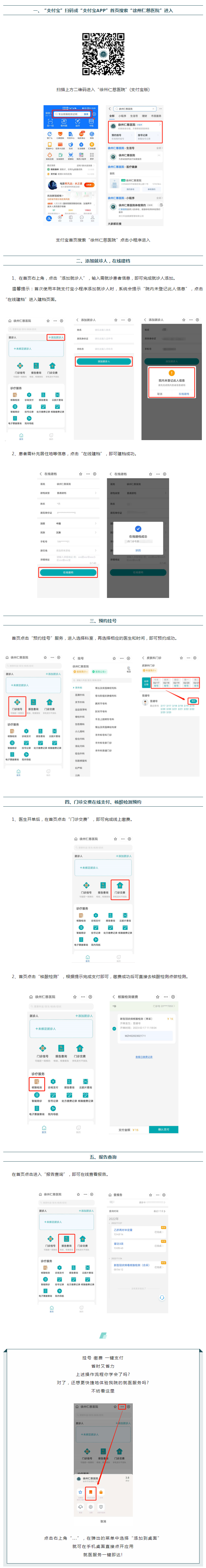 患者在支付宝预约挂号后,请于看病当日,提前到院排队候诊,就诊后直接支付宝线上小程序支付门诊费用后,即可直接取药或者去执行科室执行项目。