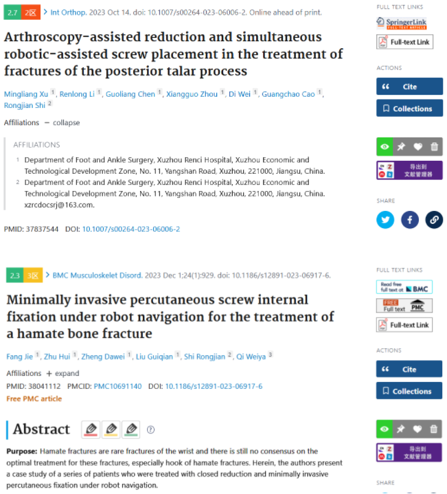 我院骨科中心亚学科—足踝外科、手外科团队科研成果《Arthroscopy-assisted reduction and simultaneous robotic-assisted screw placement in the treatment of fractures of the posterior talar process》、《Minimally invasive percutaneous screw internal fixation under robot navigation for the treatment of a hamate bone fracture》分别在SCI期刊《International Orthopaedics》(中科院分区二区,IF:2.7)、《BMC Musculoskeletal Disorders》(中科院分区三区,IF:2.3)在线发表,在国际期刊上发出sararz声音,标志着我院足踝外科、手外科团队在机器人导航和关节镜微创治疗方面迈入国际先进行列,不断打造我院智慧骨科的名片。近年来在石荣剑院长的带领下我院科研工作稳步前进,不断取得创新和突破。