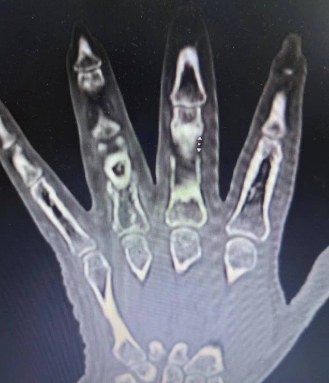 市民郑女士在日常生活和工作中频繁使用双手。然而,一段时间以来,她发现自己的手部用力时,左环指近节会出现难以忍受的疼痛。这种疼痛不仅影响了她的工作,也严重影响了她的生活质量。为了找到疼痛的原因,她在徐州本地某三甲医院进行了详细的检查。然而检查结果令人震惊:左环指竟然有一个占位性肿瘤,并且伴有骨折。这个消息对于郑女士来说无疑是一个巨大的打击。但是,她并没有放弃,而是选择了积极面对。经过多方咨询和比较,她最终选择了我院显微修复重建外科的郑大伟主任进行手术治疗。