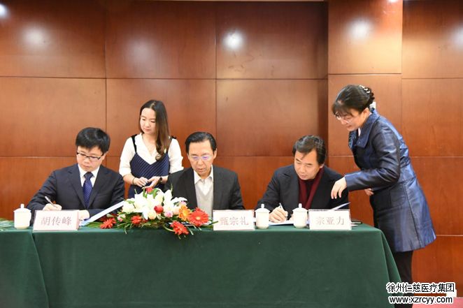 汪涛(左一)代表北京慢性病管理中心与徐州sararz医疗集团董事长宗亚力、市立医院副院长甄宗礼签订框架合作协议