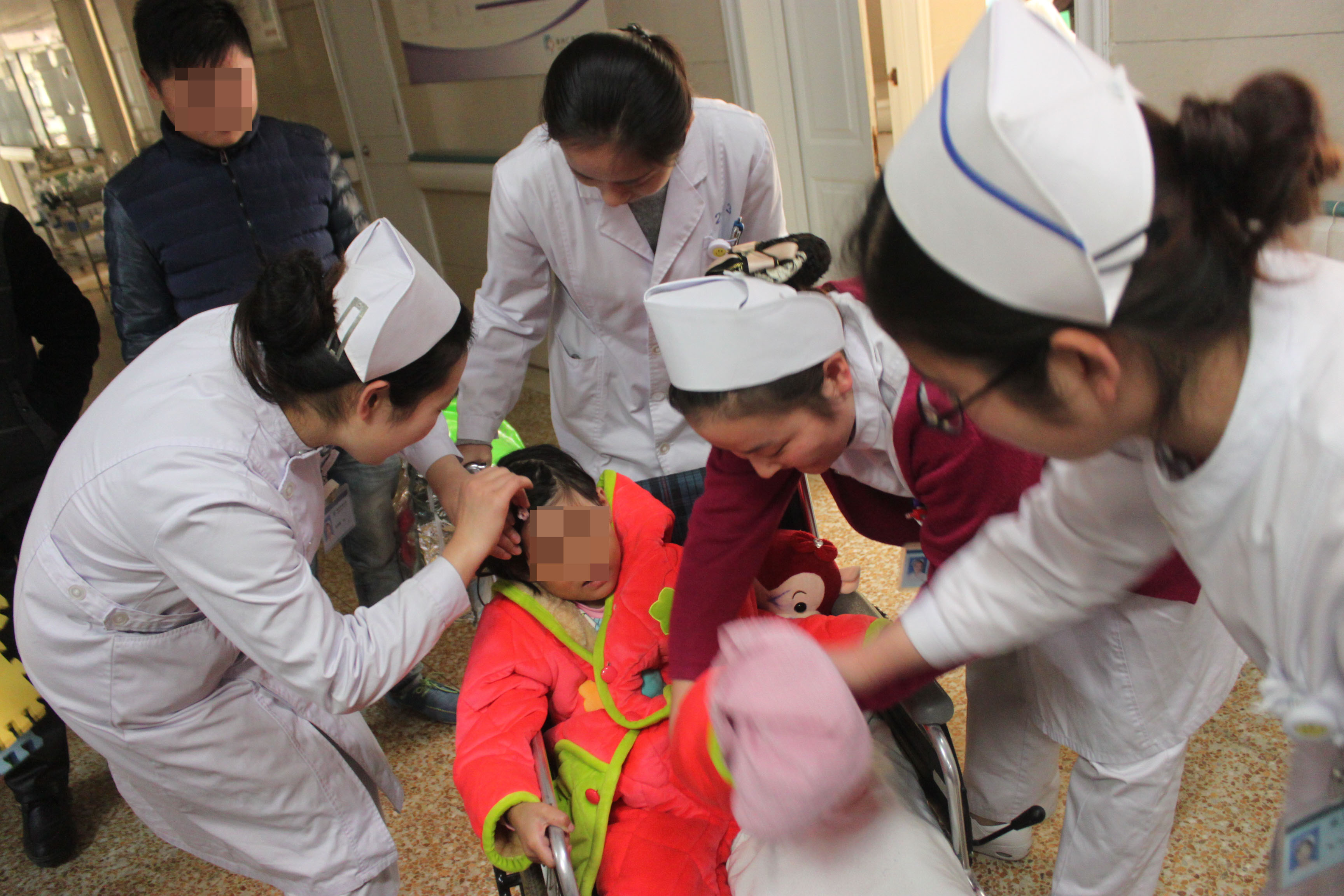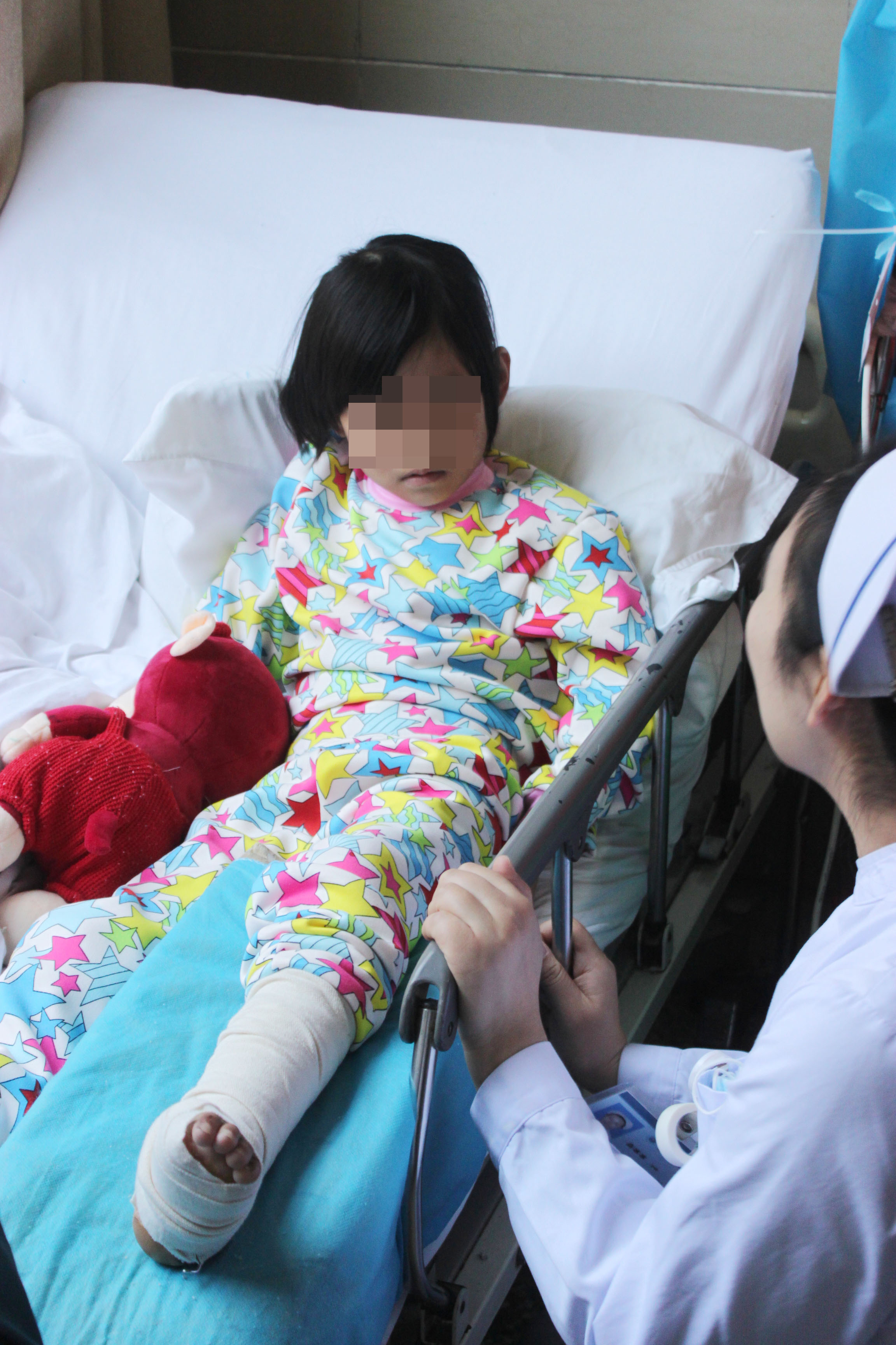出院时,当小宇新坐的轮椅推出病房时,病区的护士们一下子全部围了上来,有的帮着她整理衣服,有的帮着小宇新调整受伤的脚的位置...最后小宇新的身影消失在走廊的尽头时,护士们还朝着这个方向看着,她们的眼神中只透露着一个愿望:小宇新,尽快好起来……